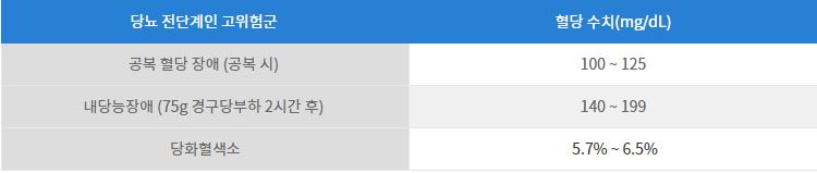 #정상 혈당 참고치(서울대학교병원 진단검사의학과) - 공복 혈당: 100 mg/dL 미만, 식후 2시간 혈당: 140 mg/dL 미만