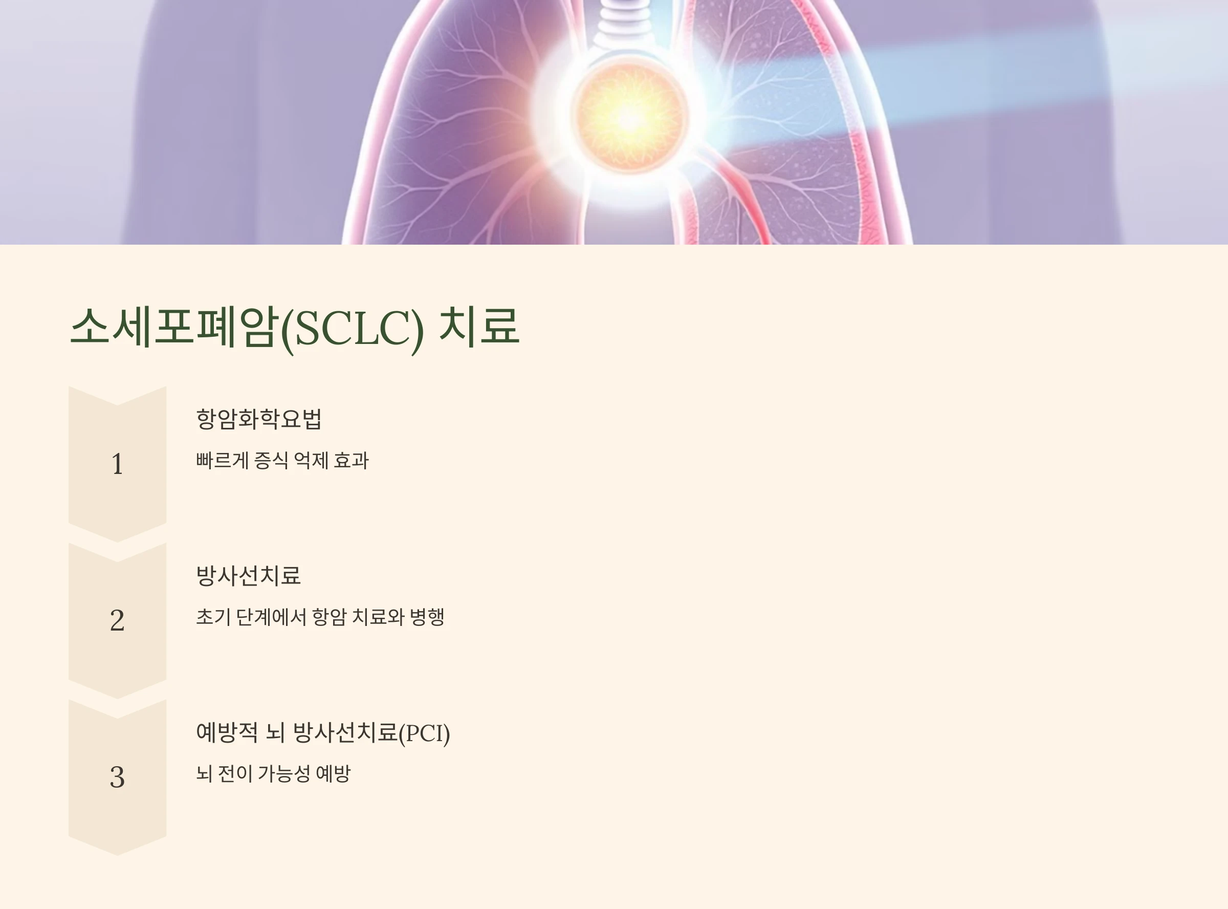 - 뇌 전이 예방 치료(예: PCI): 소세포폐암은 뇌 전이 위험이 있어 예방적 방사선치료를 고려하기도 합니다.
